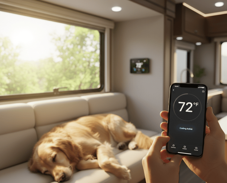 Smart mobile Hub replaces outdated RV thermostats with a modern touchscreen controller. Precise temperature control, real-time monitoring, and a clean interface — built for full-timers, travelers, and pet owners.